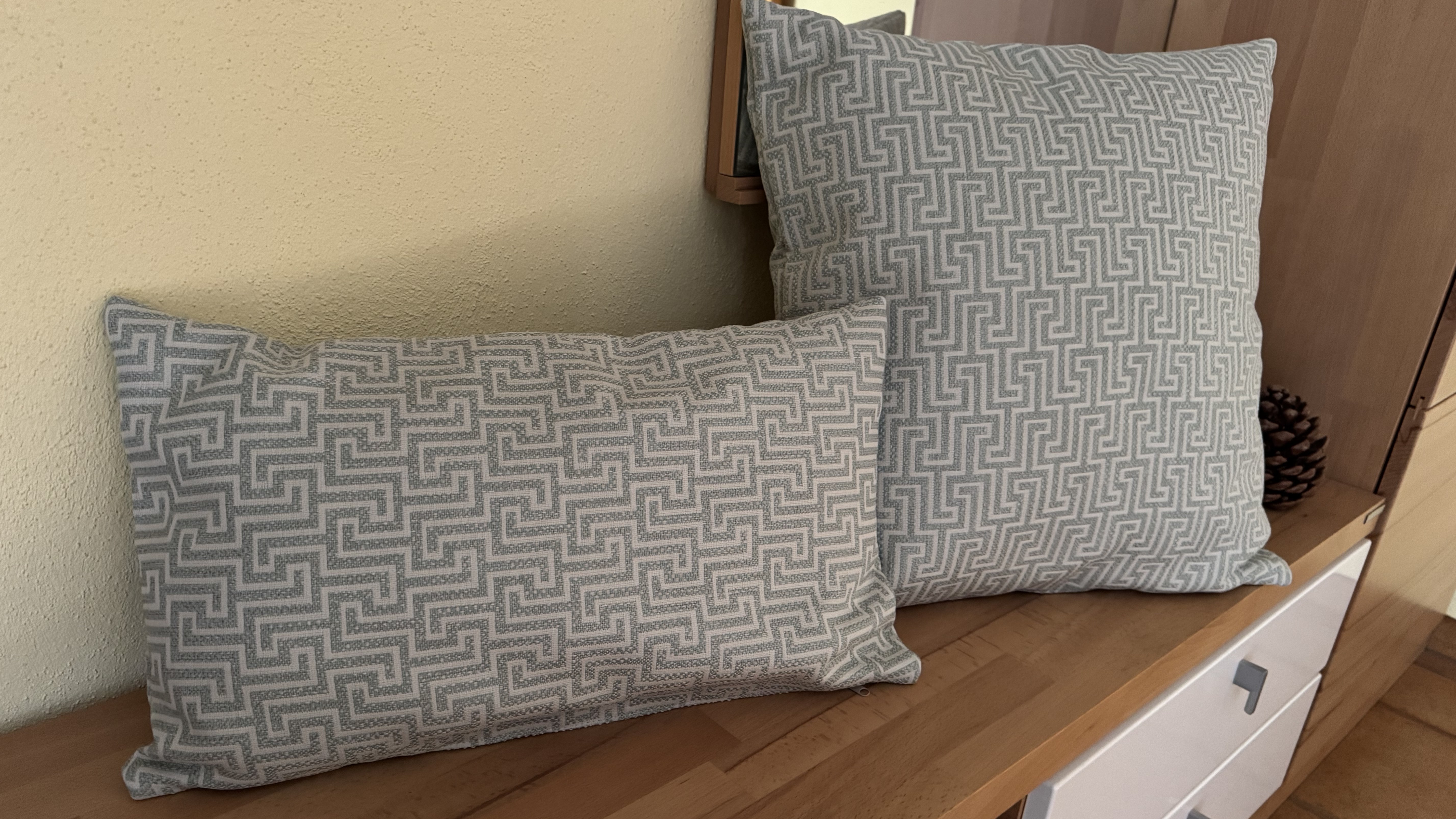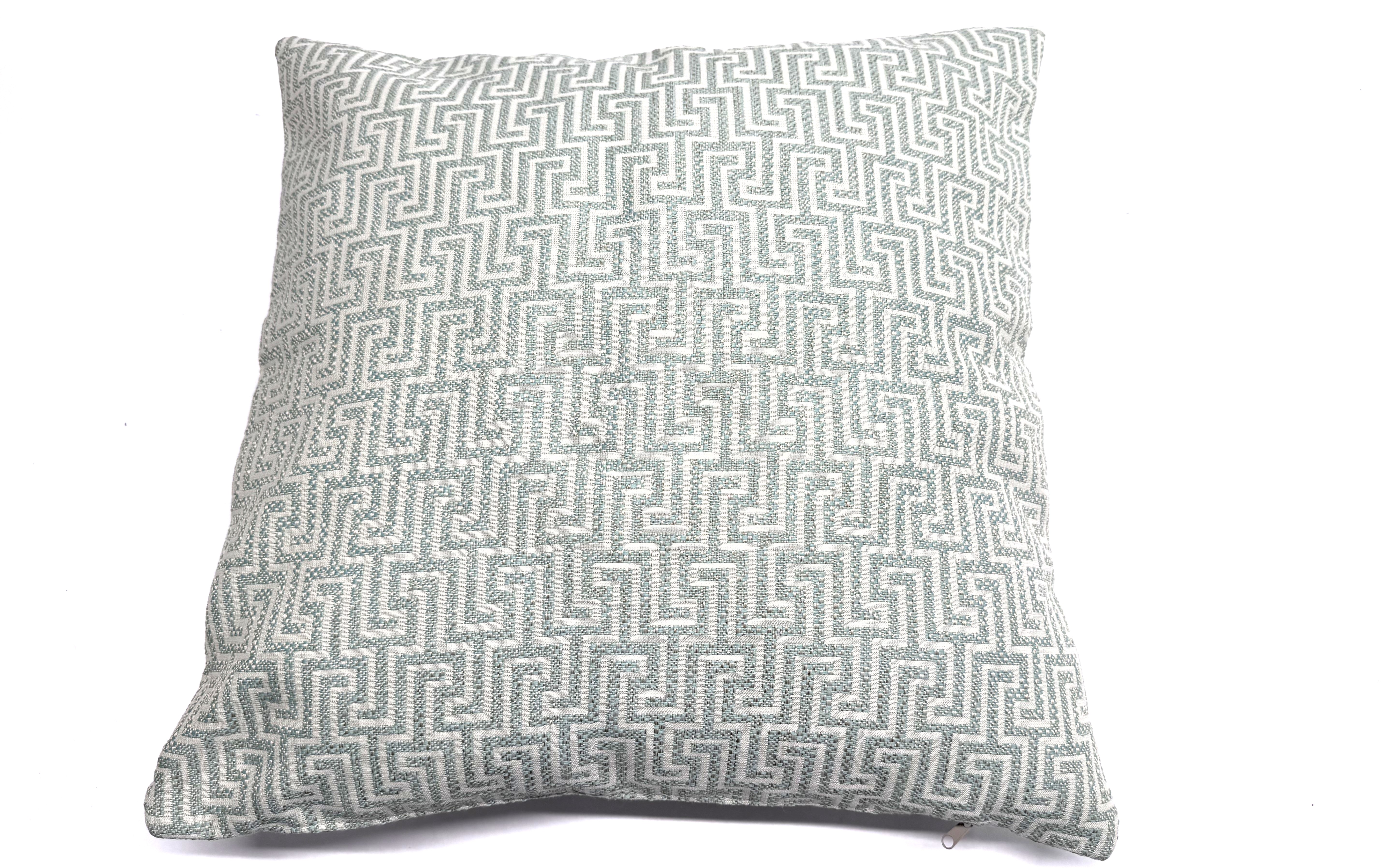 Bezugsstoff: gemustert, aus 100% Polyester Farbe: türkis-beige Kissenbezug waschbar bei 30°C Mit Vlies-Kissenfüllung Bitte beachten: Muster varriert je nach Zuschnitt