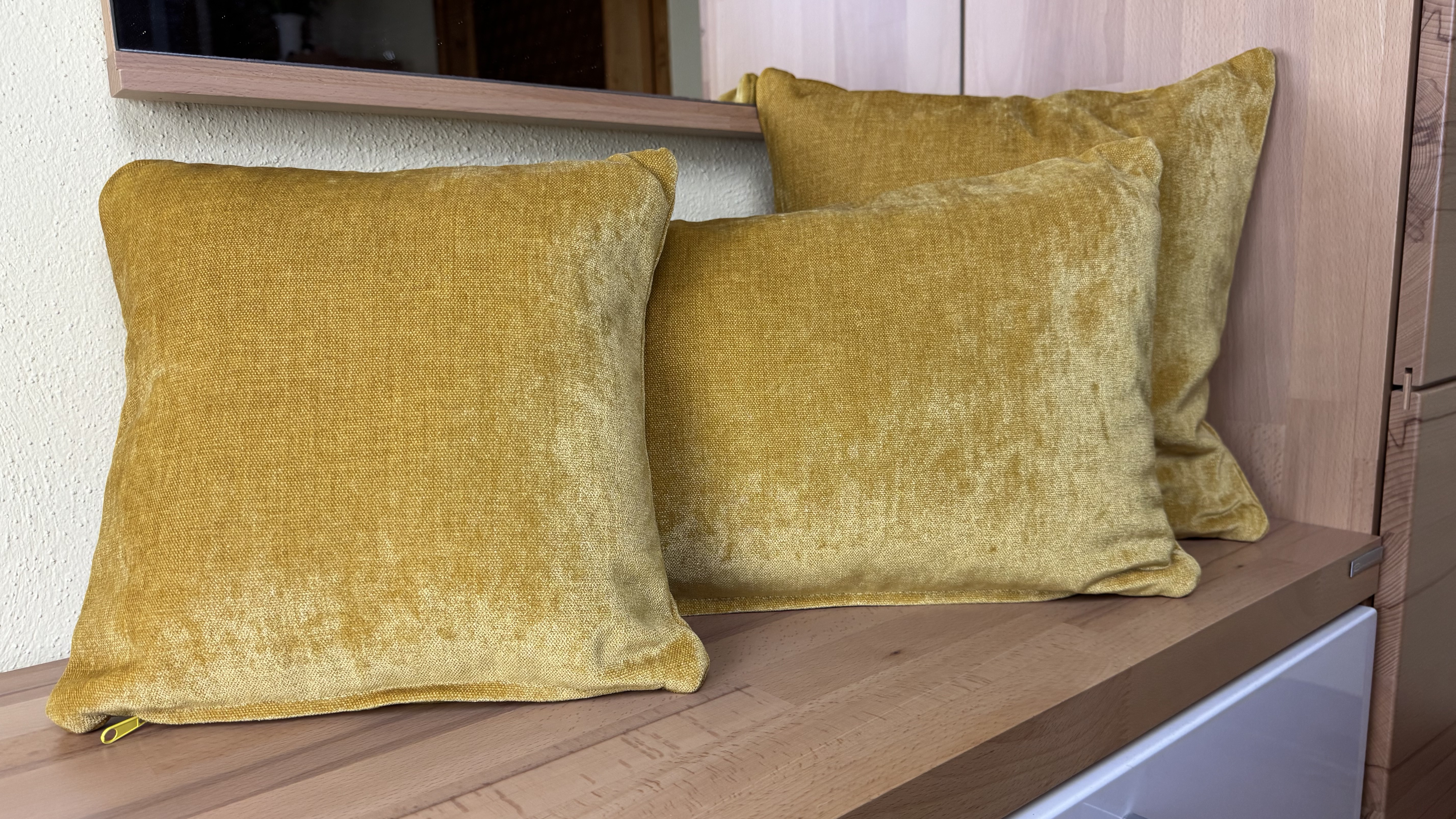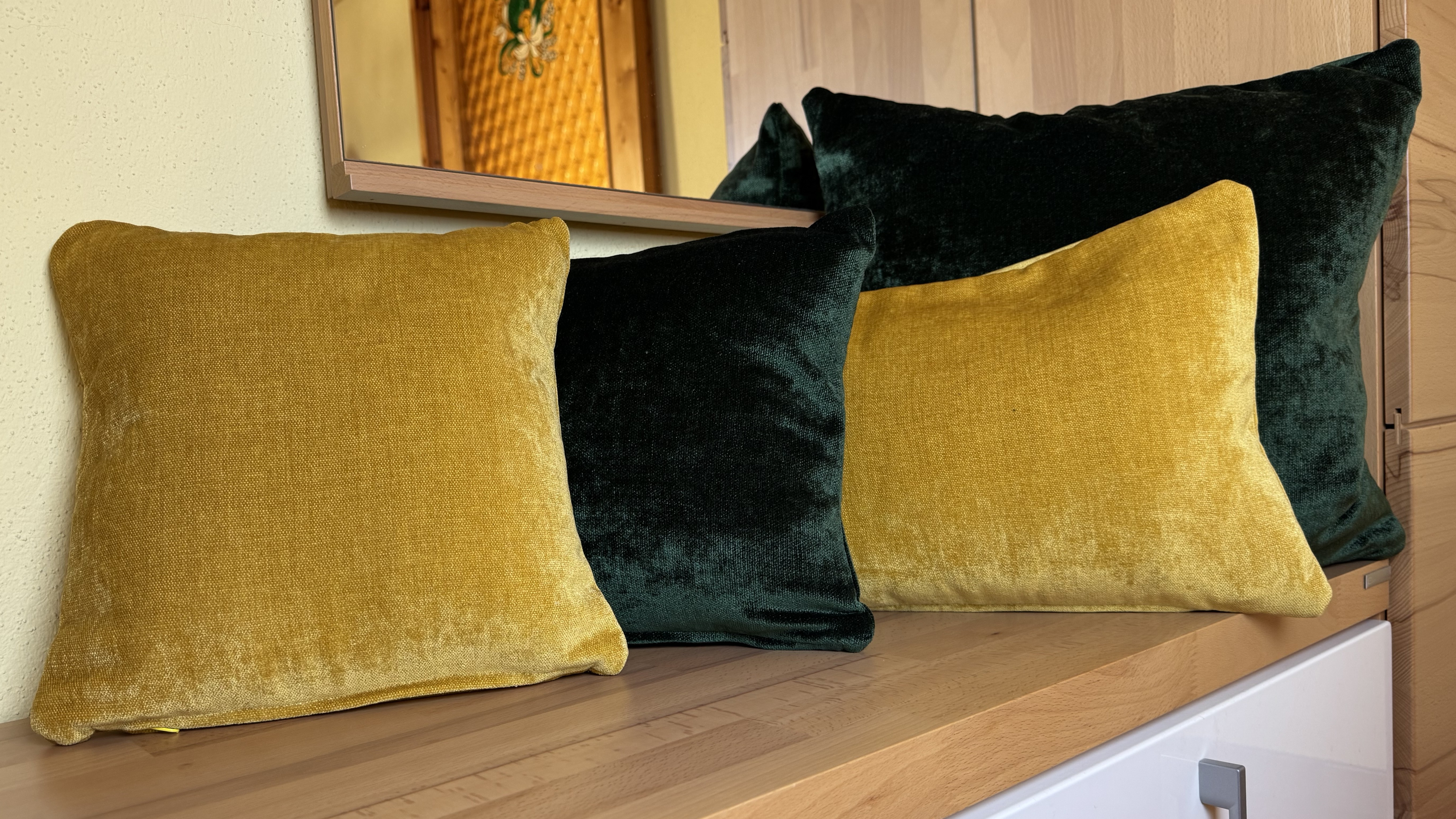 Mobile Preview: Dekokissen Chenille grün und gelb auf Bank