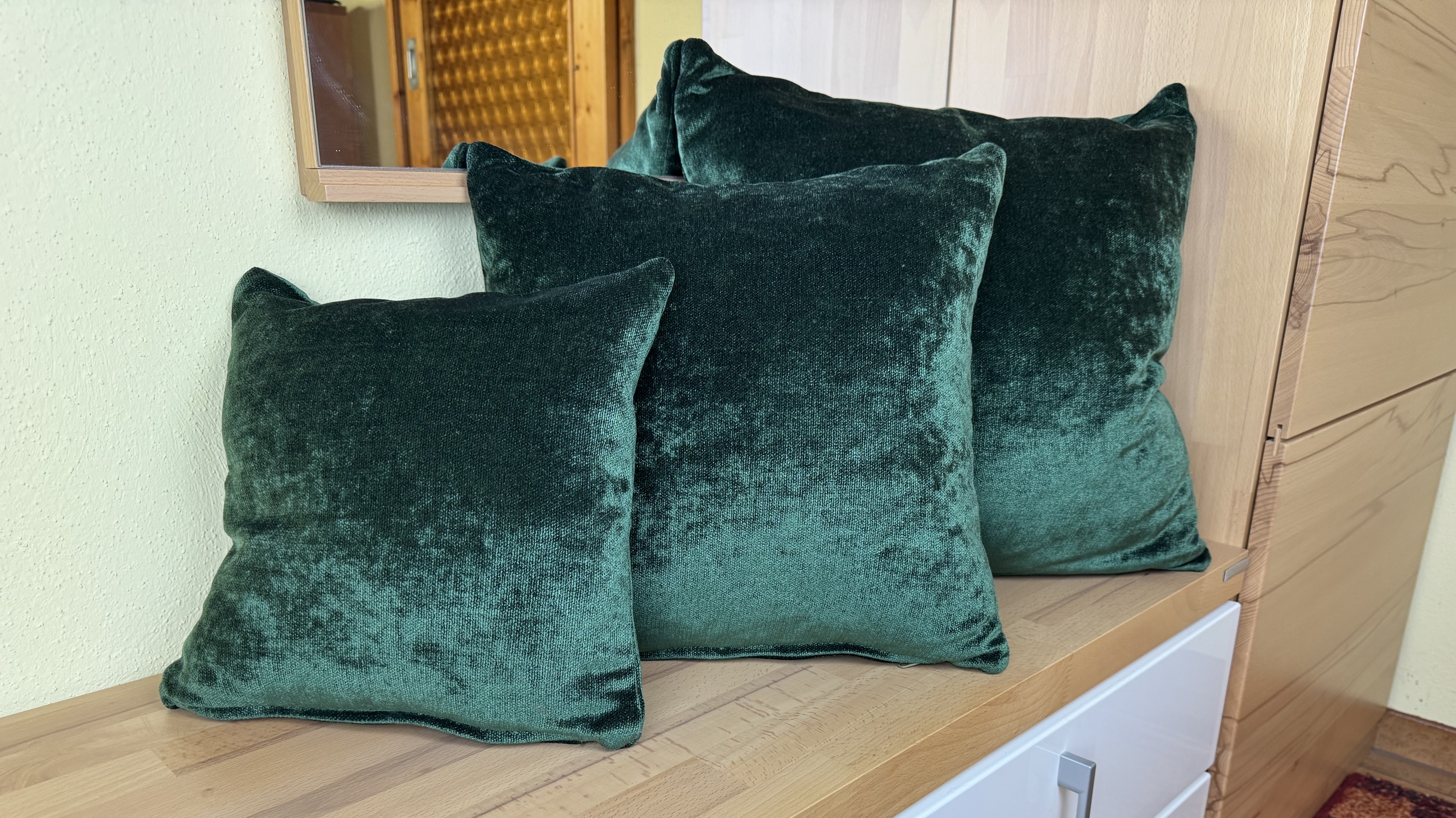 Mobile Preview: Dekokissen Chenille grün auf Bank
